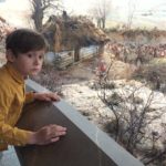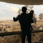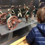 Punkt 13:30 nastąpiła płynna wymiana zwiedzających – „Proszę kierować się prawą stroną na górę”. Ślimakiem, w nieco mrocznym oświetleniu udaliśmy się na górę rotundy. Maciek, jak nie Maciek – oniemiał! I to chyba nawet nie ze względu na efekt 3D 😉 Zabrał dziadka za rękę i z szeroko otwartymi oczami próbował ogarnąć ogrom obrazu i ogrom szczegółów, które na nim są namalowane. Stef oczywiście (zgodnie z przewidywaniami obsługi) był znudzony totalnie, a że nie chciałam go puścić samopas to wyrażał głośno swoje niezadowolenie – na górze podłoga nie jest płaska i miałam lekkie obawy, czy Stefiś nie fiknie w dół w ekspozycję przed obrazem – i po 10 minutach seansu zajęliśmy się chodzeniem po schodach, ale tak, żebym mogła słuchać, co lektor opowiada z głośników. W ciągu 30 minutowego pobytu w górnej części rotundy spokojnie jesteśmy w stanie samodzielnie obejrzeć obraz, porobić zdjęcia, a potem wysłuchać historię nie tylko dziejów powstania obrazu, ale i krok po kroku prześledzić z przewodnikiem historię uwiecznioną na tym dziele. Po wszystkim można iść jeszcze zobaczyć wystawę w małej rotundzie, gdzie znajdziemy makietę bitwy oraz figurki żołnierzy.