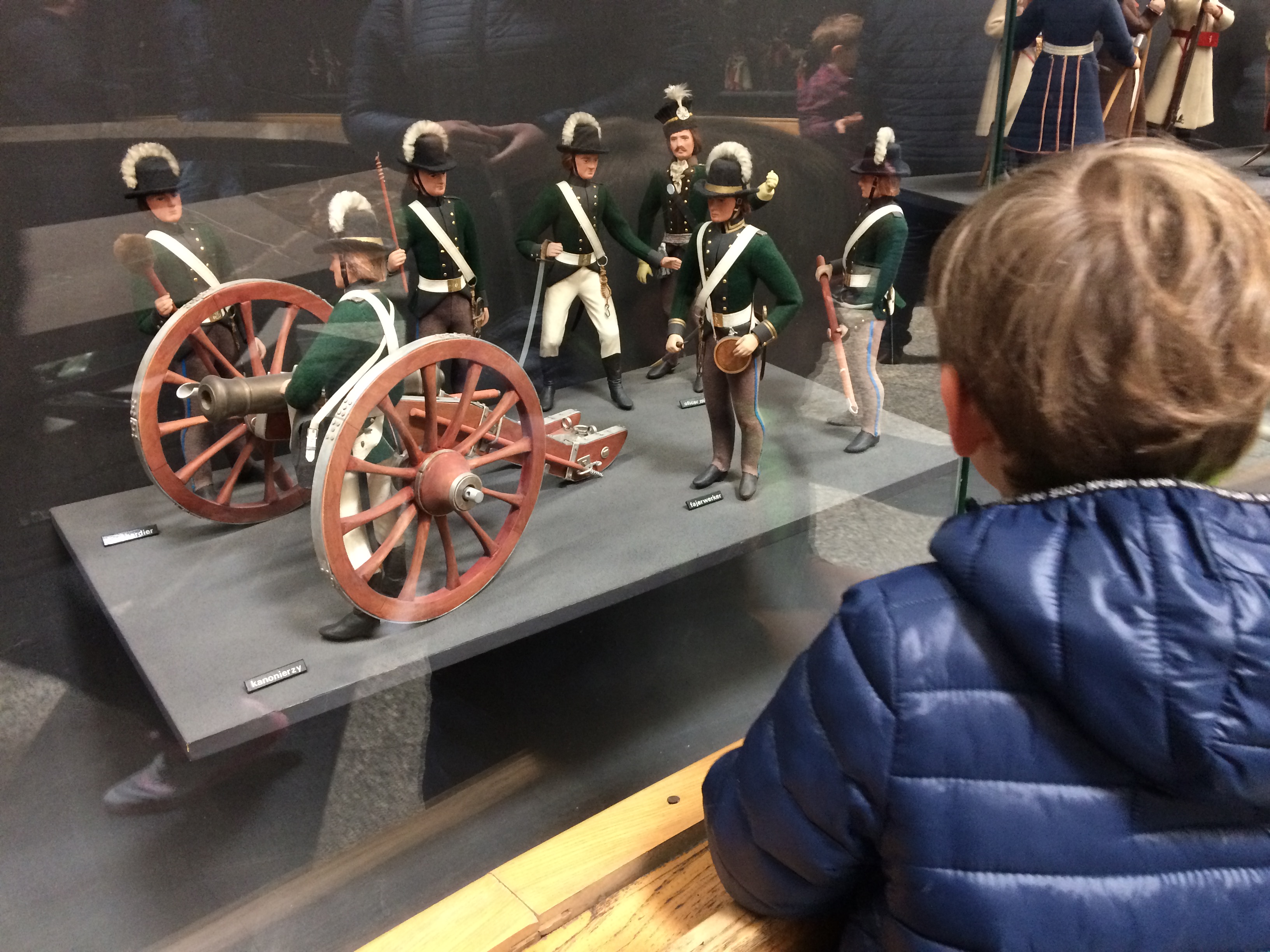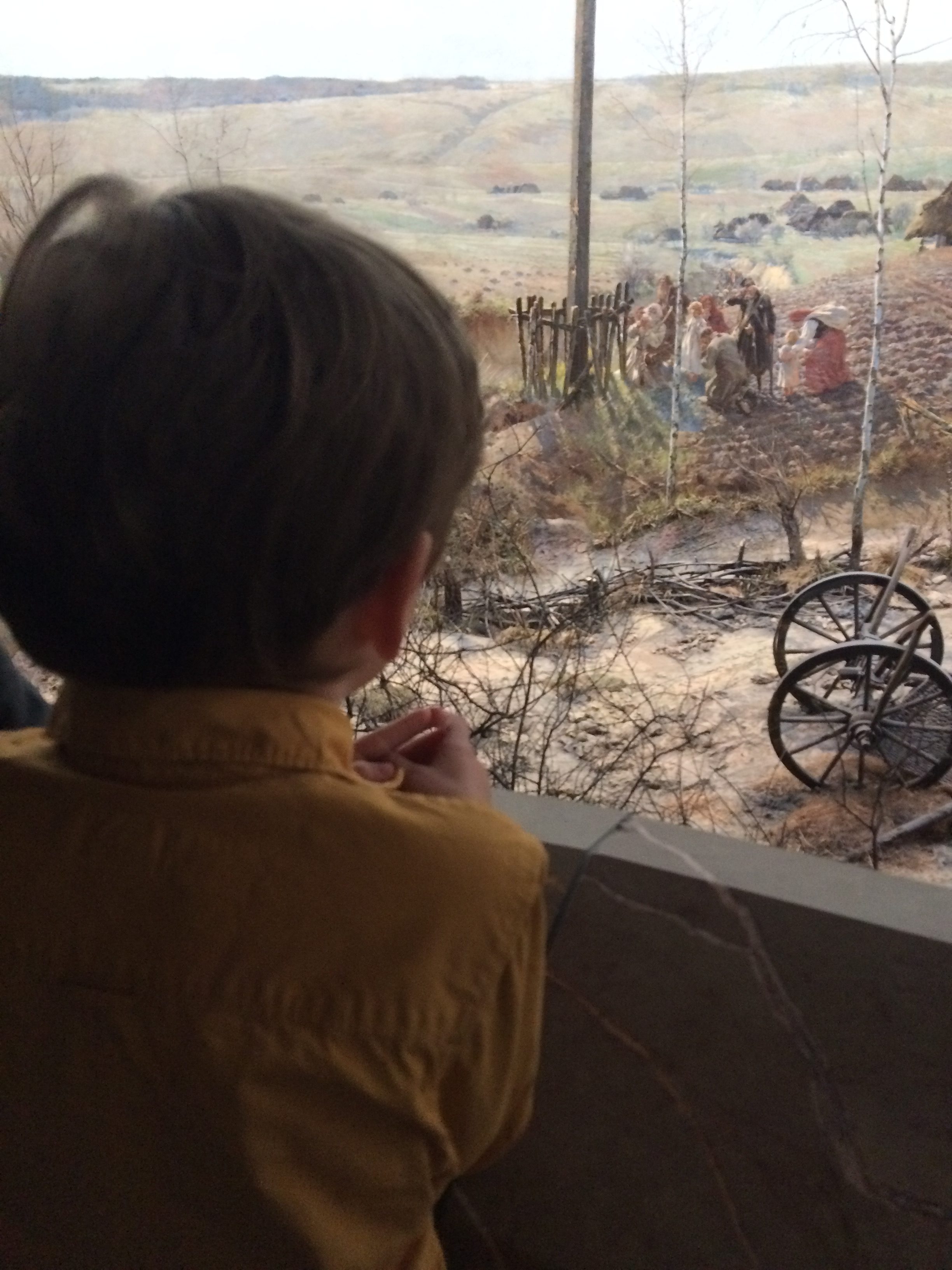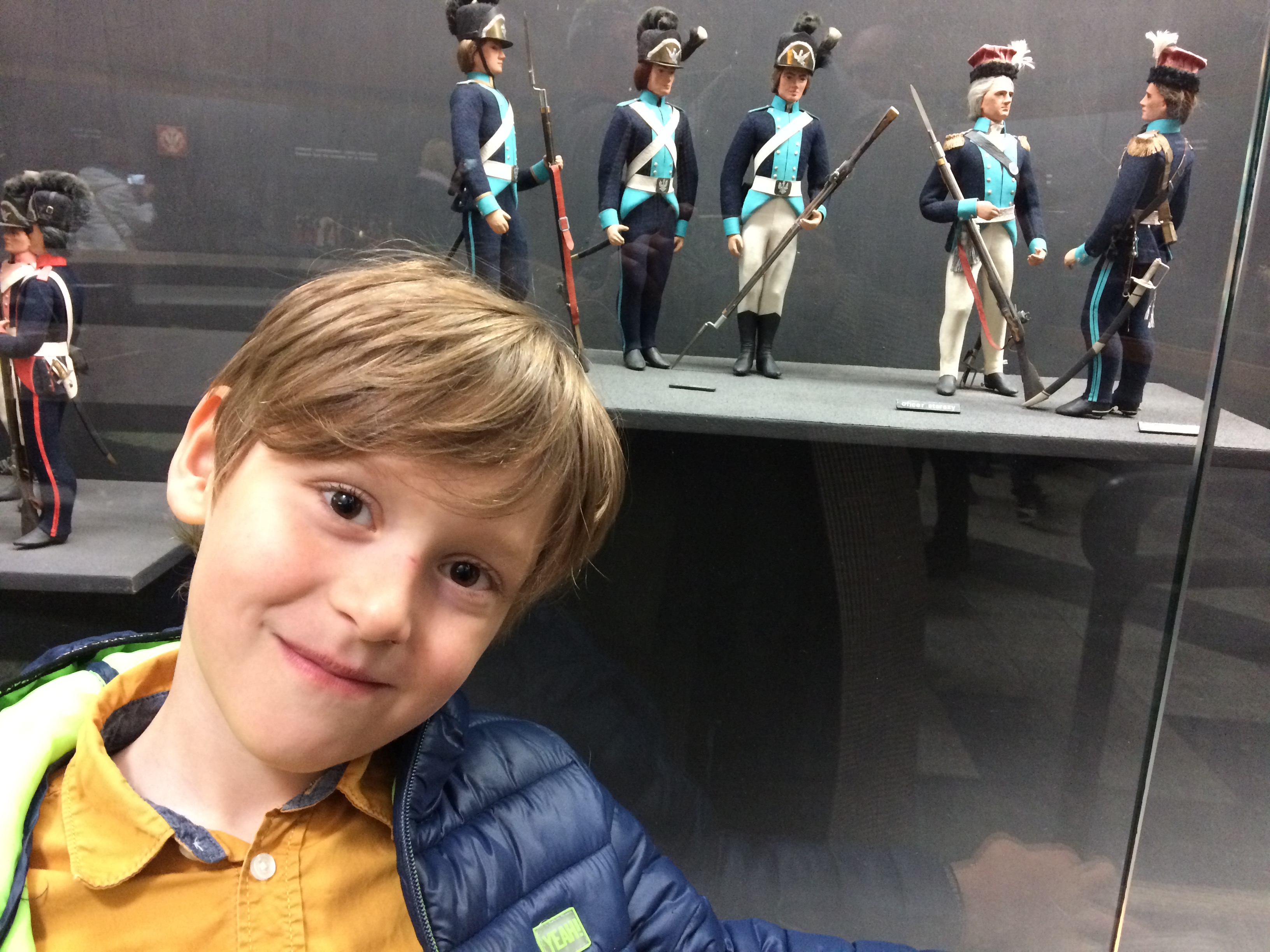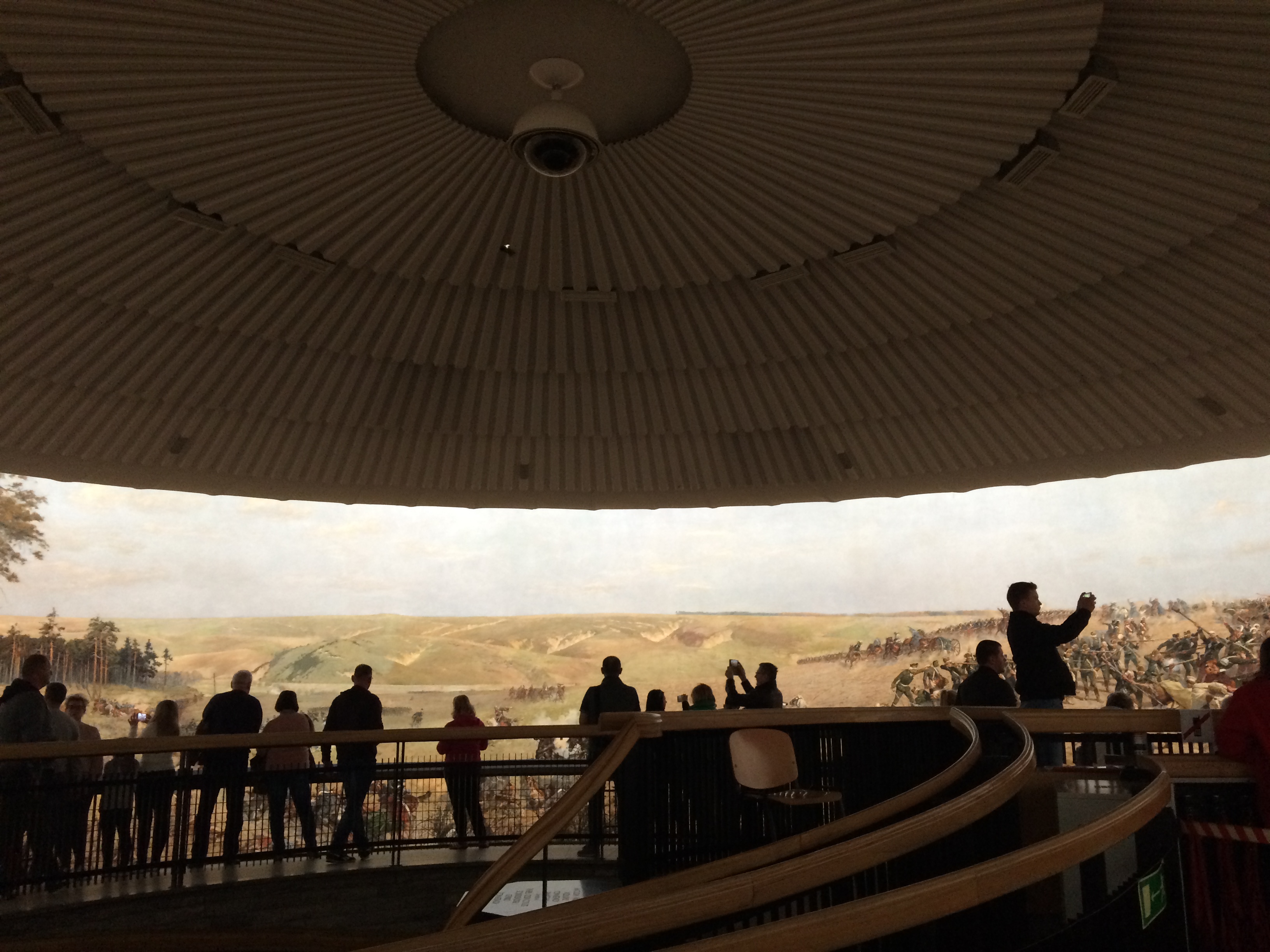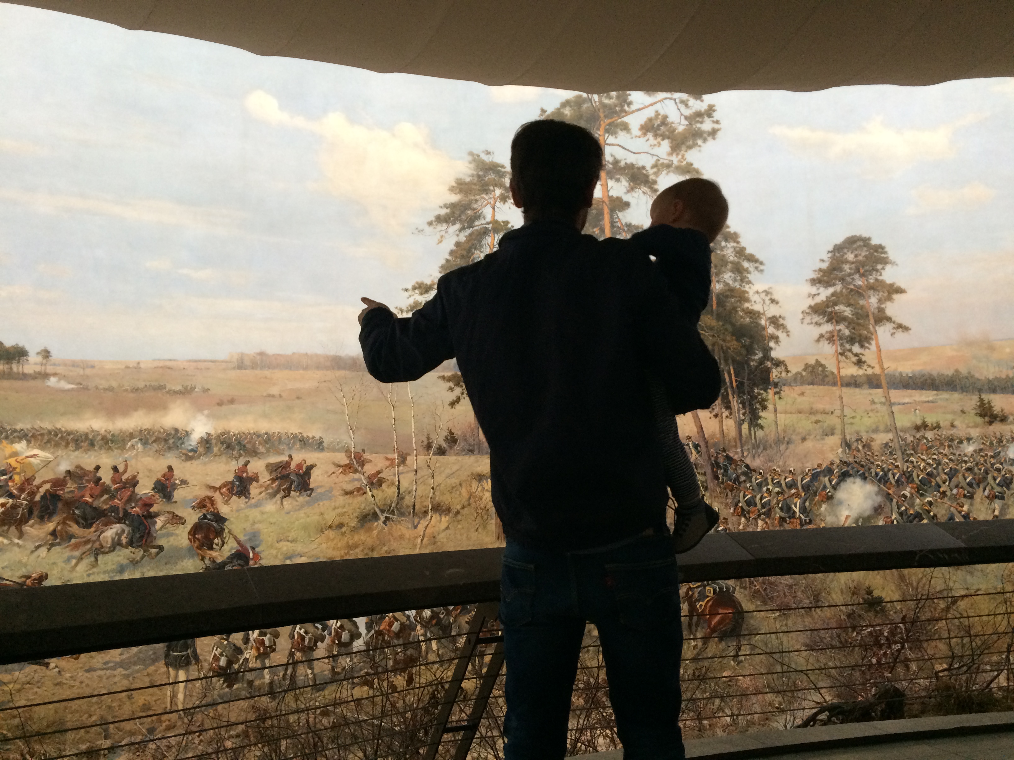 Punkt 13:30 nastąpiła płynna wymiana zwiedzających – „Proszę kierować się prawą stroną na górę”. Ślimakiem, w nieco mrocznym oświetleniu udaliśmy się na górę rotundy. Maciek, jak nie Maciek – oniemiał! I to chyba nawet nie ze względu na efekt 3D 😉 Zabrał dziadka za rękę i z szeroko otwartymi oczami próbował ogarnąć ogrom obrazu i ogrom szczegółów, które na nim są namalowane. Stef oczywiście (zgodnie z przewidywaniami obsługi) był znudzony totalnie, a że nie chciałam go puścić samopas to wyrażał głośno swoje niezadowolenie – na górze podłoga nie jest płaska i miałam lekkie obawy, czy Stefiś nie fiknie w dół w ekspozycję przed obrazem – i po 10 minutach seansu zajęliśmy się chodzeniem po schodach, ale tak, żebym mogła słuchać, co lektor opowiada z głośników. W ciągu 30 minutowego pobytu w górnej części rotundy spokojnie jesteśmy w stanie samodzielnie obejrzeć obraz, porobić zdjęcia, a potem wysłuchać historię nie tylko dziejów powstania obrazu, ale i krok po kroku prześledzić z przewodnikiem historię uwiecznioną na tym dziele. Po wszystkim można iść jeszcze zobaczyć wystawę w małej rotundzie, gdzie znajdziemy makietę bitwy oraz figurki żołnierzy.